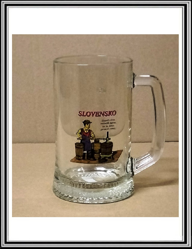 Hrubý pollitrový sklenený krígeľ SLOVENSKO 21...Staré víno , mladá žena....