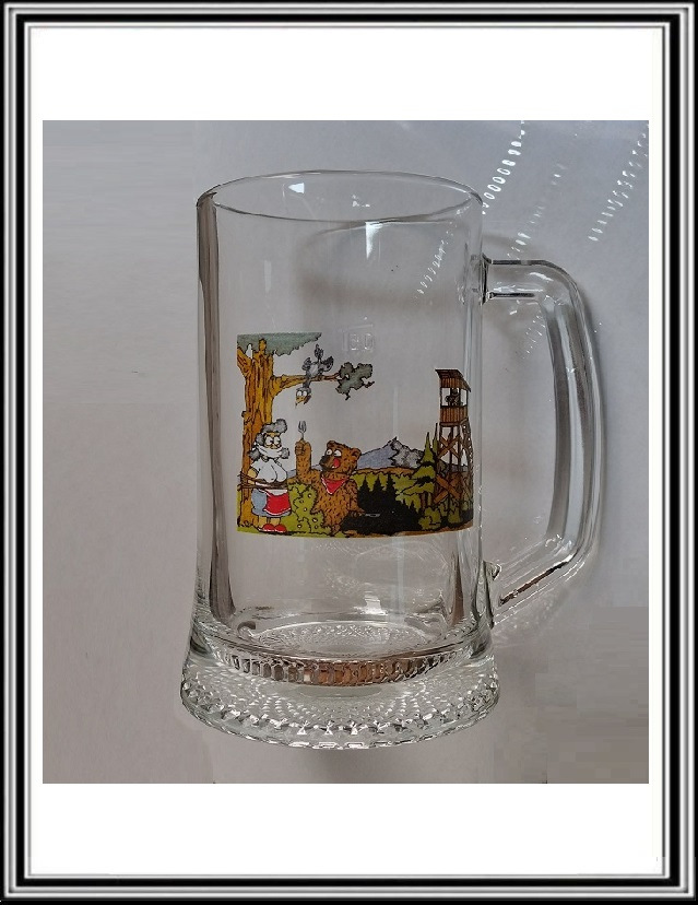 Hrubý pollitrový sklenený krígeľ SLOVENSKO 24...Poľovník ako návnadu priviazal ženu