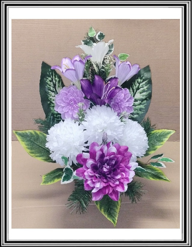Kvety v miske vysoké 63 cm č 833 - fialovými kvetmi a bielými chryzantémami