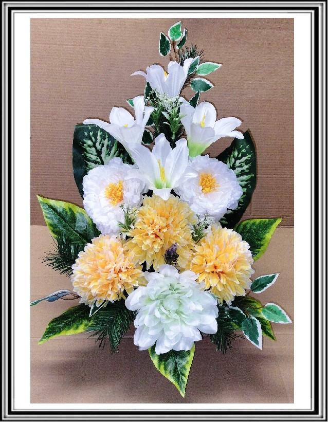 Kvety v miske vysoké 63 cm č 835 - veľkými bielymi kvetmi a žltými chryzantémami