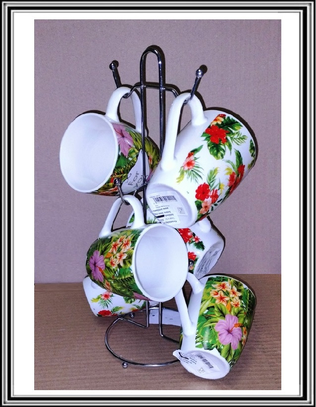 Sadá 6 ks keramických hrnčekov na stojane 300 ml cafe (zabalené v celofáne)