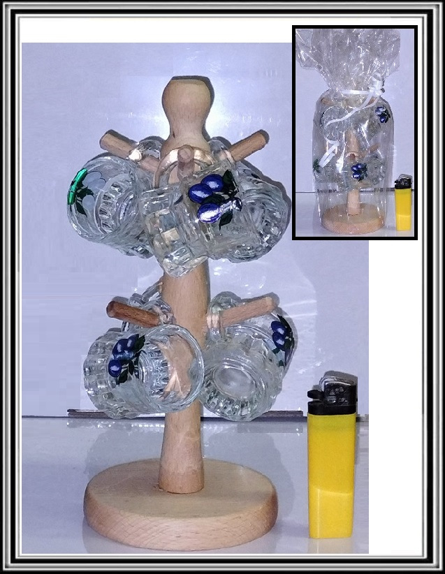 Sadá 6 ks štamperlíkov - s uchom na veľkom stojane–slivka