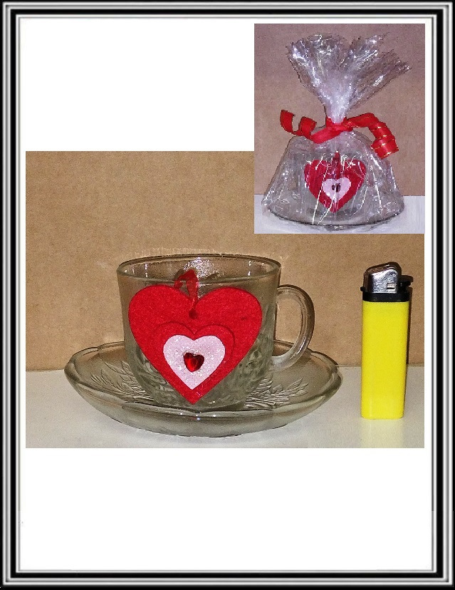Sklenená šálka s tanierikom ruža a so srdiečkom , zabalené v celofáne č.2